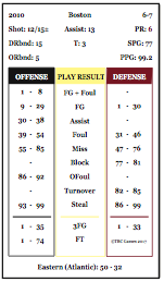 Game flow is still controlled by the ratings on the team card and the deck of 100 Factor Cards. Assume Los Angeles (L) 2010 is on offense, Boston 2010 is on defense. The Factor Card you flipped in the Select Shooter Sequence states Center - 14 (Offense). Since this is team game